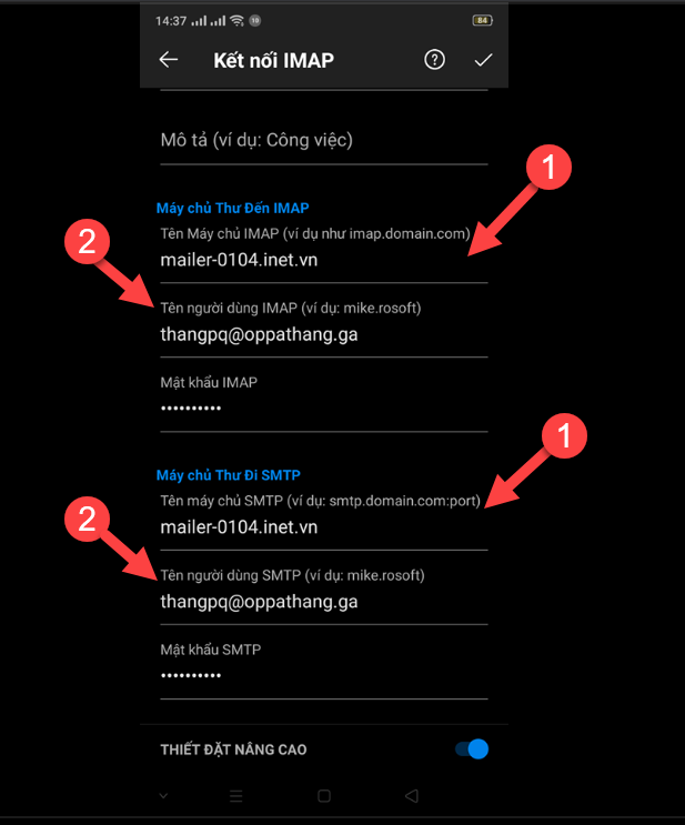 - Các bạn điền đầy đủ thông tin mail cá nhân của mình vào rồi chọn Nâng cao